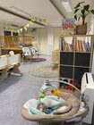 De dreumesruimte bevindt zich op de bovenverdieping van de units. De ruimte is uitdagend ingericht en handpop 'Puk' heeft een eigen huisje. We kunnen met zijn allen aan tafel aan de hoge tafels met banken, maar er is ook een lage tafel met lage stoeltjes waar ook gespeeld en geknutseld kan worden.